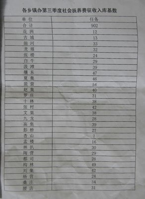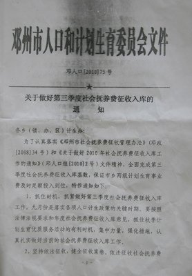 记者7月27日到邓州市采访时,举报村民给记者出示了一份邓州市人口和计划生育委员会下发的“邓人口(2010)75号”红头文件,主题是“关于做好第三季度社会抚养费征收入库的通知”,红头文件后附有“各乡镇办第三季度社会抚养费征收入库基数”,邓州所属28个乡镇街道办总任务数为902万元,其中,古城办事处第三季度任务基数为13万元,最高的裴营村54万元,其他各乡镇办事处二三十万元、四十多万元不等。