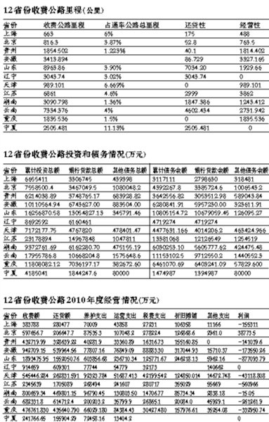 12省份公布的内容主要有《收费公路信息公开表》和《收费公路主线站点分布图》两项。《收费公路信息公开表》包括收费公路里程、主线收费站、投资情况、债务情况以及2010年度经营情况几个大项。