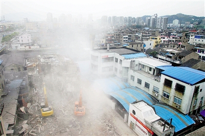 昨天旧村拆迁的第一站位于龙湾区永中街道镇中片旧村,该区出动6台挖掘机,从早上一直作业至傍晚,共拆除38幢旧房和3间厂房。据介绍,该地块占地83亩,需拆除旧房面积8.2万平方米,建筑密度达70%以上,涉及拆迁的旧房共有居民369户、企业8家。经龙湾区前期的拆迁工作,昨天拆迁时仍有42幢旧房需要拆除。该地块的安置房年初已开工建设,外迁集聚点将于明年10月建成,就地安置房建设周期为两周年。