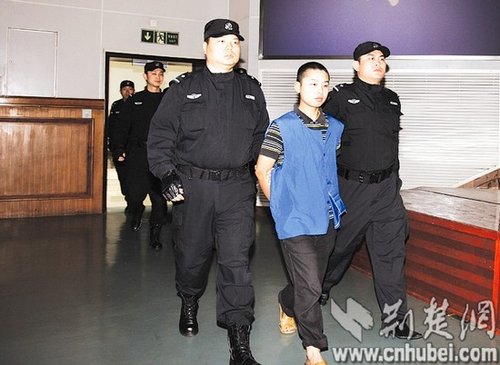 图为:王海剑(中)被押入法庭听判