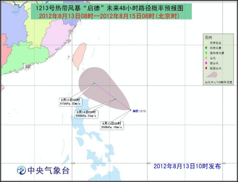 据监测,今年第13号热带风暴“启德”(KAI-TAK,名字来源:中国香港,名字意义:香港旧机场名)于8月13日08时在台湾鹅銮鼻东南方约920公里的西北太平洋洋面上生成,就是北纬16.9度,东经127.8度,中心附近最大风力有8级(18米/秒),中心最低气压为998百帕。