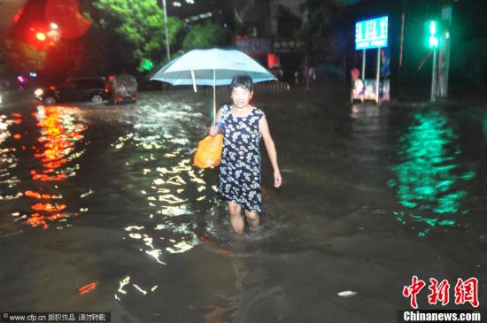 8月21日,南昌坛子口立交积水,交通阻塞,行人水中行走。图片来源:CFP视觉中国