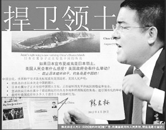 中国江苏黄埔再生资源利用有限公司董事长陈光标先生,2012年8月31日在美国《纽约时报》刊登广告,郑重宣布钓鱼岛自古以来就是中国的领土。在广告中他指出,“日本右翼分子正在侵犯中国领土主权,正在破坏西太平洋地区的稳定和安全”。
