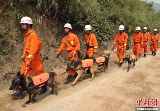 9月9日,云南彝良县“9.07”抗震救灾进入第三天,离黄金72小时生命时间越来越近,参与搜救的云南、四川消防官兵兵分多路加大灾区搜救力度。图为云南消防增派力量深入震中加大搜救力度。中新社发 刘忠俊 摄