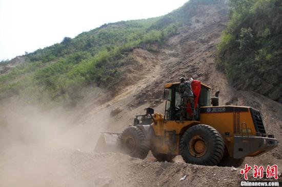 9月9日,成都军区驻渝某集团军工兵团受命抢修从石坪通往洛泽河镇的道路。参加抢修生命线的官兵大多参加赴黎维和任务,凯旋回国后又马上投入泸州50年一遇特大抗洪抢险,如今,他们又接受云南彝良抗震救灾的考验。图为救援现场。中新社发 彭小明 摄