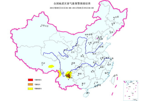 中新网9月19日电 国土资源部今日在其官方网站上发布9月18日-19日全国地质灾害气象预警预报结果。预报称,云南北部局部发生地质灾害的可能性大。