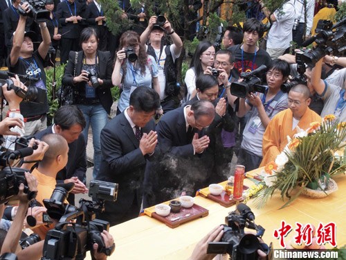 9月14日,在云南腾冲光复68年之际,来自海峡两岸的政要、退役将领、僧众、远征军老兵及家属等2000余人,齐聚腾冲国殇墓园,追荐中国远征军阵亡将士。图为中国国民党副主席林丰正中、云南省统战部部长黄毅(中左)祭拜远征军亡灵。中新社发胡远航摄