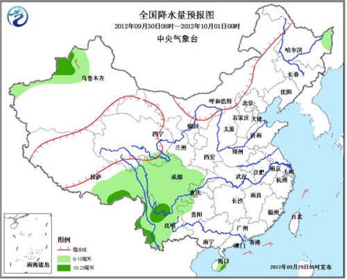 30日08时至10月1日08时,青藏高原东部、西南地区大部、新疆西部、海南等地有小到中雨。新疆北部有5~6级风。东海大部海域有6~8级偏北风。