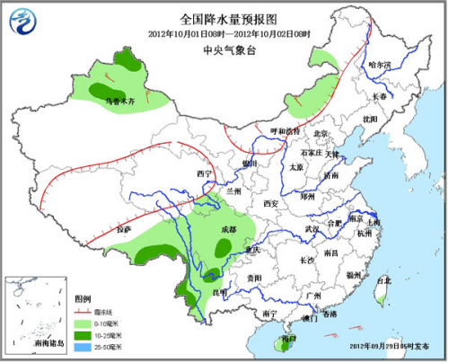 10月1日08时至2日08时,新疆北部、内蒙古中东部、青藏高原东部、四川、云南中西部等地有小到中雨,海南有中到大雨。新疆、内蒙古中西部等地有4-6级风,阵风可达7级。