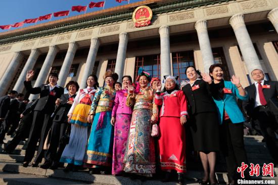 中国共产党第十八次全国代表大会11月14日上午9时在北京人民大会堂举行闭幕会。会前,少数民族代表等在人民大会堂前合影留念。中新社发盛佳鹏摄