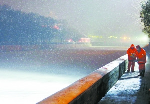 昨晚雪花飘飘,为了游客的安全,环卫工人在故宫筒子河步行道撒融雪剂。 记者 戴冰摄