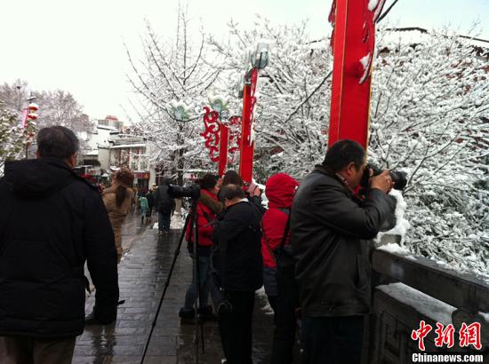 一场突如其来的暴雪下了整夜,使得19日晨的江苏水陆空交通处于半瘫痪状态。然而在南京著名景点夫子庙,“上班族”出家门第一件事不是赶着去单位上班,却成了扫雪和摄影客。朱晓颖摄