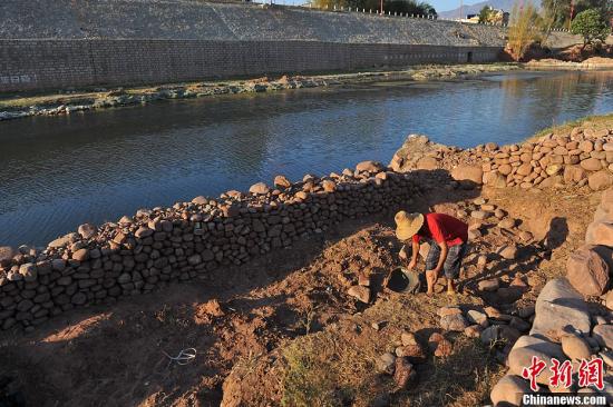 2月21日,位于云南省楚雄州元谋县境内的龙川江因旱大面积缩水,几近断流,河床变菜地。龙川江为金沙江南岸一级支流,在元谋县北部汇入金沙江。图为一农民在河床上修整菜地。任东摄