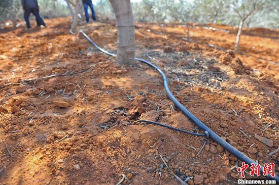 2月21日,云南省楚雄州永仁县用“滴灌”技术种植耐旱的油橄榄和葡萄,把水管道直接插入植物蓄水的根部以节约用水。据了解,因连年的干旱,当地转变生产模式,新兴种了上万亩油橄榄和葡萄等耐旱作物。这些耐旱的经济作物每年可以节约200多万方水,节水率达到70%以上。楚雄正遭受着连续5年的干旱,许多村庄出现不同程度的用水困难。图为用滴灌技术种植油橄榄。中新社发任东摄