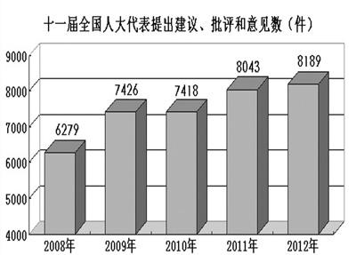 十一届全国人大期间,代表提出建议的积极性明显增强,建议质量不断提高。五年来,代表们紧紧围绕党和国家中心工作,提出代表建议37527件,比上届增加了9649件,增幅达到34.6%。这些建议中,有14834件是代表们在开展专题调研、视察、座谈、走访基础上,认真酝酿提出的,占建议总数的39.5%;还有很多建议是代表们结合本职工作,总结实践经验,经过慎重考虑后提出的,建议内容更加符合实际情况,更有针对性和前瞻性。