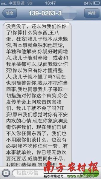 4月10日下午,张丽告称自己在网上举报蔡某涛后,遭到了蔡某涛的辱骂和死亡威胁。张丽还向记者提供了威胁短信。短信内容有“或者和我单挑都可以,见面我就让你死”,“现在也明确警告你,我从不把你当回事,我也同意我儿子采取一切措施对付你这个疯狗”等字眼。发出信息的正是蔡某涛常用的手机号码。