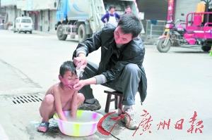 没到男士洗澡时间,一个小男孩只能由妈妈打了盆热水出来,由爸爸在路边帮他洗。