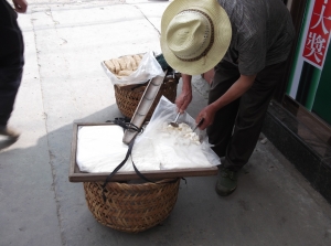 “叮、叮、叮,兑糖儿吃”!远远听到兑糖客的声音,糖贩客挑着一担竹制的糖贩篰,篰上放着四方形的糖盆格,摆上一板糖儿并盖上竹匾,手里拿着小铁锤碰糖刀,不时发出敲打声,到处走街串巷招揽生意。一边敲打糖刀,一边喊着,“糖儿吃了娒娒不赖娘,快点拿来东西兑糖吃,废铜烂铁拿出来,高处站起寻,矮处蹲下寻,明处伸手拿,暗处点灯寻”。孩子们闻声纷纷向父母大人哇哇讨要废品兑糖吃。当家家户户拿出废品时,兑糖客就用小铁锤敲糖刀,打下一片糖儿给孩子吃,不少孩子百吃不厌。