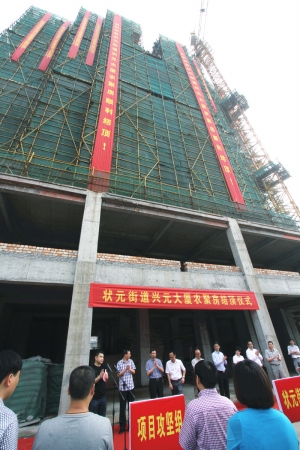 状元街道办事处有关负责人介绍,兴元大厦农聚房是我区第一批农聚房项目。2011年9月开工建设,经过一年多的努力,主体工程已经结顶,预计今年10月将完成建筑装饰及安装附属工程。该大厦座落在状元街道龙腾南路和兴元路交叉口,地上16层,地下一层,共有套房64套,目前为状元街道第一高楼,也是我区首个结顶的农房集聚项目。
