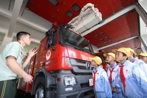 5月28日,区妇联组织40余位新居民子女到市公安消防局龙湾分局体验消防生活,提前为新居民学生过一个别样的儿童节。图为在永宁消防中队,新居民学生参观各种消防车等先进消防设备。叶晓东 赖圣卿 摄