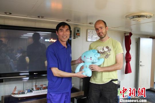 法国专家获赠吉祥物“青青”。图片由“向阳红09”船提供。通讯员图片由“蛟龙号”船提供摄