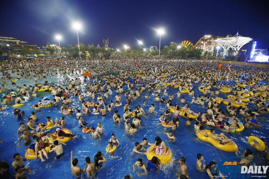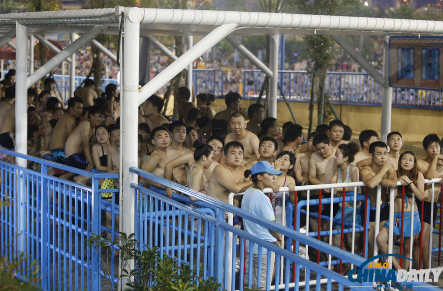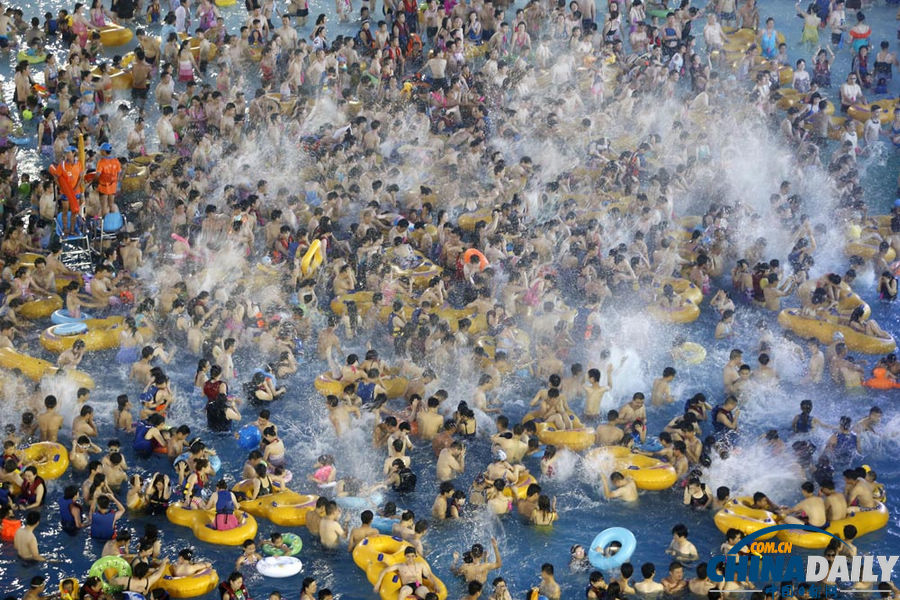 2013年7月13日是入伏首日,和全中国大部地区一样,湖北武汉同样高温难耐,连发高温预警。在武汉一家大型主题水上世界游乐场,场内爆满场外翻台,市民排着队到泳池里避暑,蔚为壮观。