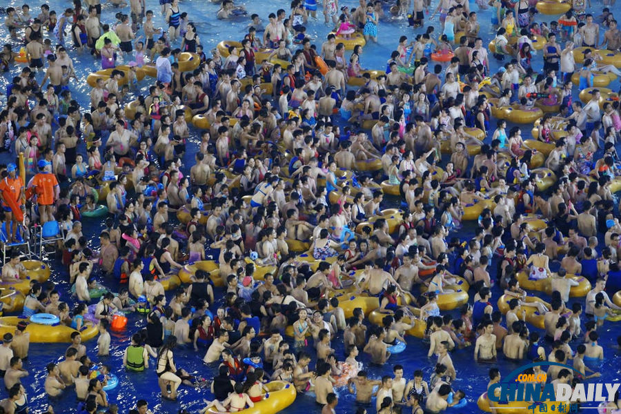 武汉一家大型主题水上世界游乐场爆满,泳池里如“下饺子”,蔚为壮观。(陈卓摄)