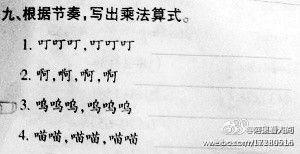 这道奇葩数学题是,“根据节奏,写出乘法算式(一组拟声词):1.叮叮叮,叮叮叮;2.啊,啊,啊,啊;3.呜呜呜,呜呜呜;4.喵喵,喵喵,喵喵。”