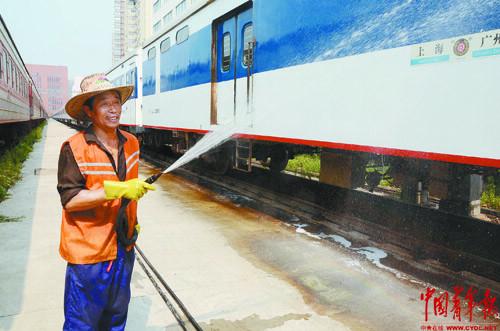 7月31日,上海客技站内,来自江苏连云港的清洁工人何守安正在清洗上海至广州的T99/100次列车。本报记者 周凯/摄