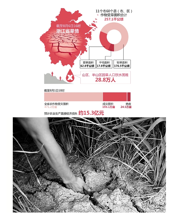 浙江在线08月09日讯 记者从省防指了解到,截至8月6日16时,浙江杭州、温州、湖州、金华、衢州等11个市60个县(市、区)受旱,作物受旱面积合计257.1千公顷,其中干枯面积17.8千公顷、重旱面积62.8千公顷、轻旱面积176.5千公顷;山区、半山区因旱人口饮水困难28.8万人。目前,城镇居民生活、生产用水正常。