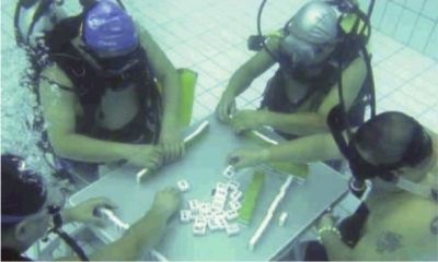 这支“水下麻将”队成立于8月7日,经过“麻友们”不断改良,如今又多了几张写有“碰”、“吃”、“杠”、“听”、“和”的牌子,省去了打手势的麻烦。虽然水底下无法付钱,但放炮最多的那个人得请大家吃晚饭。