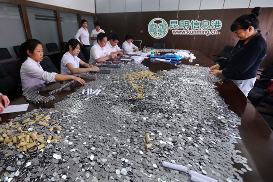 8大口袋一角的硬币,18名银行工作人员从上午9点数到下午6点才清点了5000多元。这是昨天环城西路昆明市工商银行西市区支行为市民吴女士办理存款业务的场景。