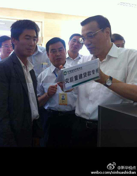 新华网北京8月18日电 根据新华社新华视点微博报道,18日,李克强到甘肃岷县农信社考察。他要求农信社为农民服好务,帮助灾区重建。他叮嘱工作人员说;“你们是在农民中成长起来的,农民是你们的客户,也是你们的衣食父母。只有他们生活好了,你们的农村信用社才能真正壮大。你们要服务,要支持,要让利。”