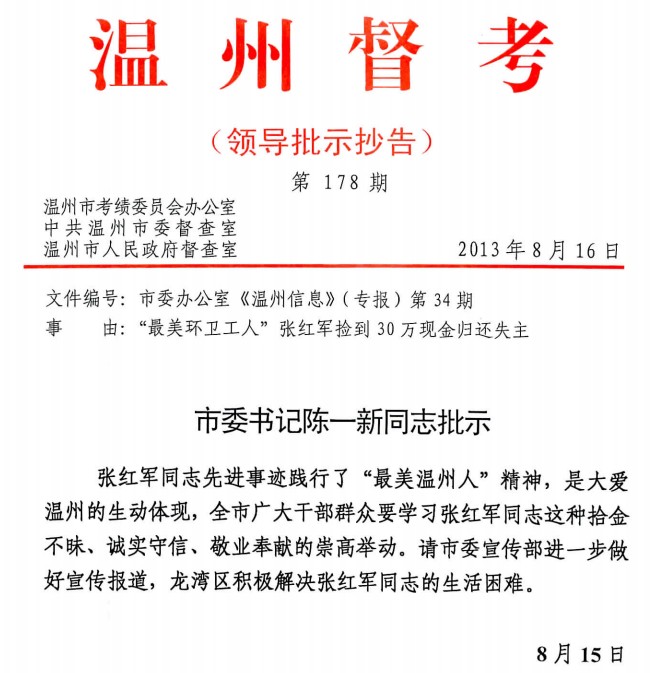 8月11日,我区环卫工人张红军面对从天而降的30万元巨款时,选择了如数归还失主。这一事迹经由区新闻中心联合《浙江日报》、浙江卫视、《温州日报》、《温州都市报》等省市媒体跟踪报道后,《人民日报》等中央媒体也进行了报道,引起了社会各界强烈反响,省委常委、宣传部长葛慧君十分重视,要求各媒体关注张红军其人其事,并宣传好、挖掘好、报道好这一典型,以弘扬社会美德,张红军也被授予“最美温州人”等称号。