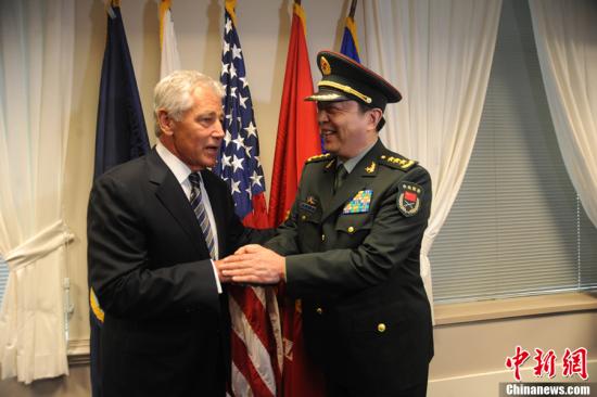 原文配图:华盛顿时间8月19日,正在美国进行正式友好访问的中国国务委员兼国防部长常万全(右)与美国国防部长哈格尔在华盛顿五角大楼举行会谈前相谈甚欢。中新社发吴庆才摄