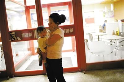 昨日凌晨,姜女士抱着孩子在暂住的肯德基门口散步。记者 王嘉宁摄