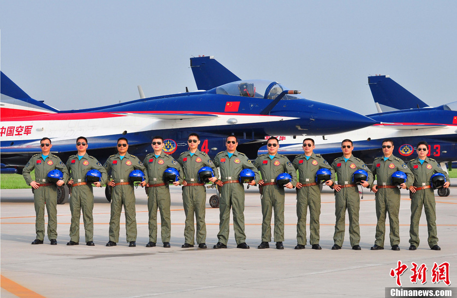 8月26日,中国空军八一飞行表演队在莫斯科拉缅斯科耶机场展开航展前的检验性飞行,当日,中国空军在莫斯科宣布,从8月30日至9月1日,八一飞行表演队将在第十一届莫斯科航展上进行3场飞行表演,准备了三个表演方案、21个动作。每场实施哪个飞行表演方案,将视当天气象条件而定。备受关注的是,中国空军同时披露了在莫斯科上空飞舞的11位飞行员名录和角色,向国际友人介绍这些“蓝天舞者”的风格与风采。图为11名飞行员合影照片。中新社发申进科摄