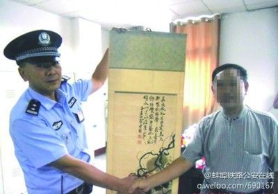 据蚌埠火车站客运二大队大队长陈富荣介绍,8月23日9点半左右,一位旅客气喘吁吁地跑到民警值班室报案,称在第三候车室上厕所时,将一幅画遗忘在厕所里,自己返回寻找未果。 “这名旅客当时也没说丢的是什么画,只说是一幅齐白石的画,非常着急,语无伦次,说话都直打哆嗦。 ”陈富荣一边安慰失主,一边带着他返回卫生间里寻找,但是找来找去,始终没有踪迹。