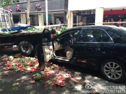 不远处有一辆宁波牌照的黑色比亚迪轿车,驾驶室的门开着,车头已经钻到前方西瓜车的底下,车上散落的西瓜碎了一地。