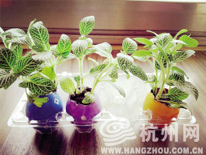 中国传媒大学范静涵利用的东西也很普通,她的作品“鸡蛋壳迷你盆栽”利用的是废弃的鸡蛋壳,制作的方法很简单但很用心,先将水彩颜料在鸡蛋壳上涂鸦并且晾干,然后放进泥土,再将植物栽进蛋壳中。