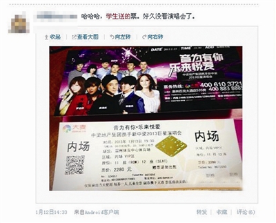 在老师晒出的学生家长们送的礼品中,既有贴心实用的手套、iphone音响等日常用品,还有家长送的演唱会门票。老师“大猫教English”更是特别评论道,“好久没看演唱会了”……而照片显示这张内场VIP的演唱会门票标价为2280元。