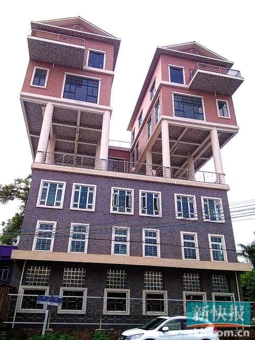 前晚10时许,网友“汉默准将0769”发微博称,东莞石碣镇存在一栋比深圳“空中庙宇”还犀利的建筑,“一房子上面新建了2套别墅”,怀疑是违建。