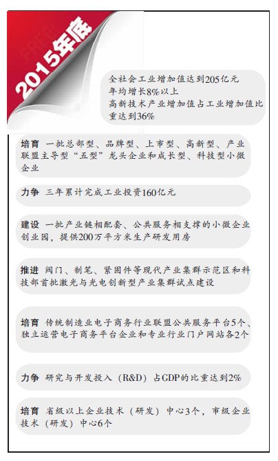 加快产业集聚平台建设。通过开展一区多园等机制体制创新,形成一批产业规模大、特色鲜明、竞争力强的产业发展平台;加快块状经济向现代产业集群转型升级,培育7个以上重点产业集群,加快发展阀门和特种不锈钢等2个冲百亿产业集群;大力培育和引进激光与光电、先进装备制造、新材料、高新技术服务等产业。