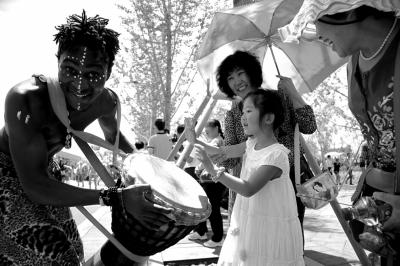 花车巡演过程中,演员与观众互动。京华时报通讯员唐涛摄