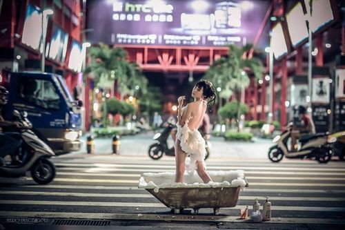 其实这张在信义区街头拍的照片让不少人惊艳,仔细瞧瞧这名正妹,不顾车来车往把浴缸搬到斑马线,当街全裸洗泡泡浴,重点部位全靠泡沫遮掩,唯美又大胆的作品开始在网络疯传。照片曝光后,网友火速找到刚从政大毕业的林亮亮,个人社交网站也有她外拍的一系列美照,精致五官在镜头前颇上相。浴缸照曝光后,人气更是暴涨,还有人怀疑是合成照。