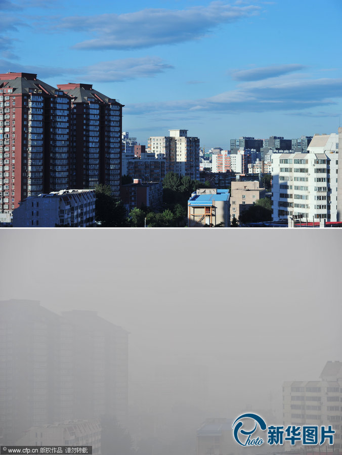 2013年10月6日,连续几天北京都笼罩在浓重的雾霾当中,由于气象条件不利于污染物扩散,雾霾天气将持续到国庆长假结束之后。图为2013年8月29日(上图)和10月6日在西直门附近同一个地点的对比拼接图。