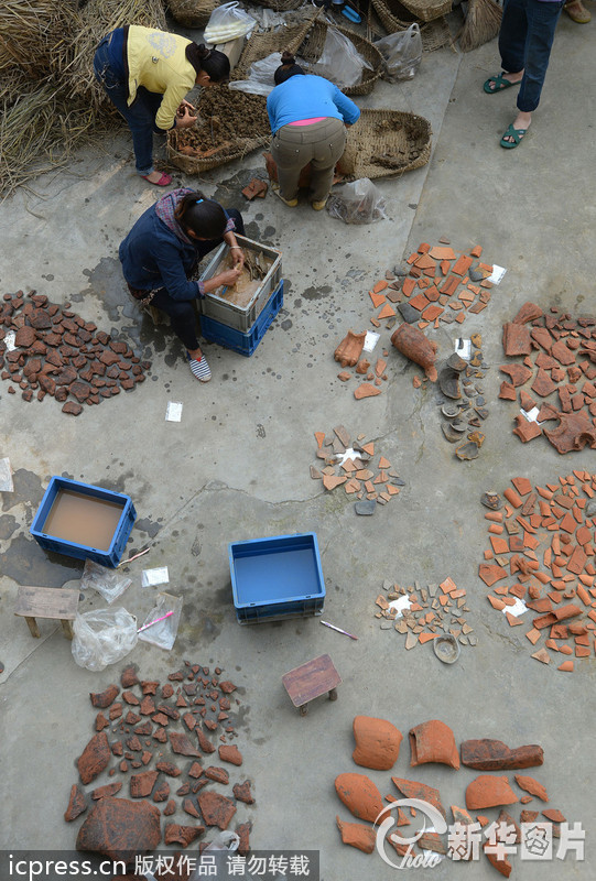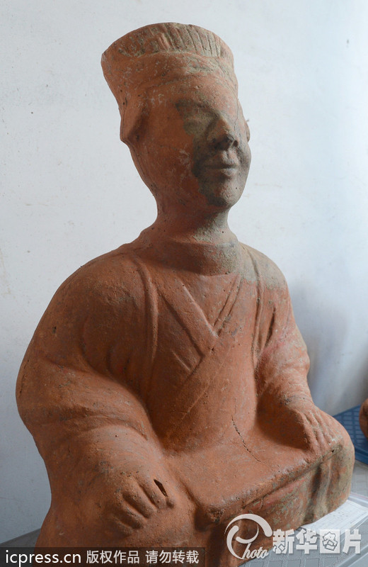 2013年10月9日,四川广汉,汉墓群考古发掘出的文物-汉代陶俑。日前,四川省考古队在广汉三水镇落经村发掘了一个汉墓群。目前,该墓群已经发现汉代墓葬38座,墓群分布范围超过10万平方米,主要由5个墓地构成。包括竖穴土坑墓8座、木椁墓1座、土坑砖室混合墓1座、砖室墓28座,最长的墓达到12米,墓葬年代涵盖西汉中期、新莽时期至东汉晚期,反映了广汉地区西汉土坑墓向东汉砖室墓的转换过程。据判断,这些墓的主人,等级在乡绅及以上。专家说,此次发掘,堪称近年来针对汉墓群的最大规模一次发掘。