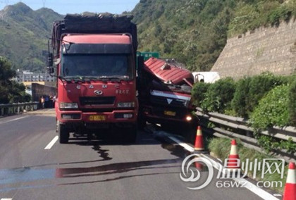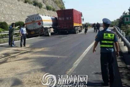 甬台温高速上油罐车追尾大货车 油罐车汽油泄漏
