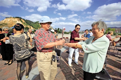 昨天是九九重阳节,是全国第一个法定老年节。我市各地举行多种多样的爱老敬老活动,共度佳节。昨日上午,15对金婚夫妇参加了在市区杨府山公园举行的“重温激情岁月·最美夕阳红”金婚庆典活动。现场男方向女方赠送玫瑰,还一同跳起了交谊舞,重温激情岁月。