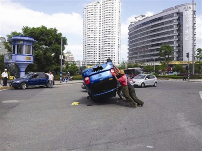 施救人员与路人合力将QQ轿车扶正。郭进摄